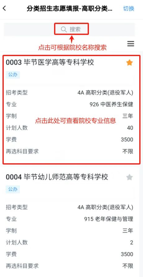 考生如想收藏某院校专业,可通过点击院校名称后★进行收藏。
