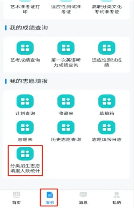 考生可通过【分类招生志愿填报人数统计】查看各院校分类招生计划人数、填报人数、比例数。点击【服务】→【我的志愿填报】→【分类招生志愿填报人数统计】查看院校填报数据。