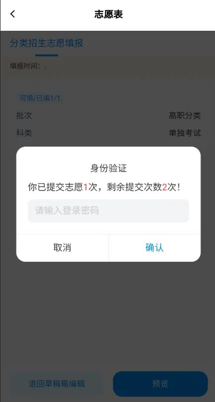 考生如需修改已提交志愿,可通过【志愿表】→【退回草稿编辑】,将已提交志愿退回至草稿箱,此时系统会提示已提交志愿表次数和剩余可提交次数。